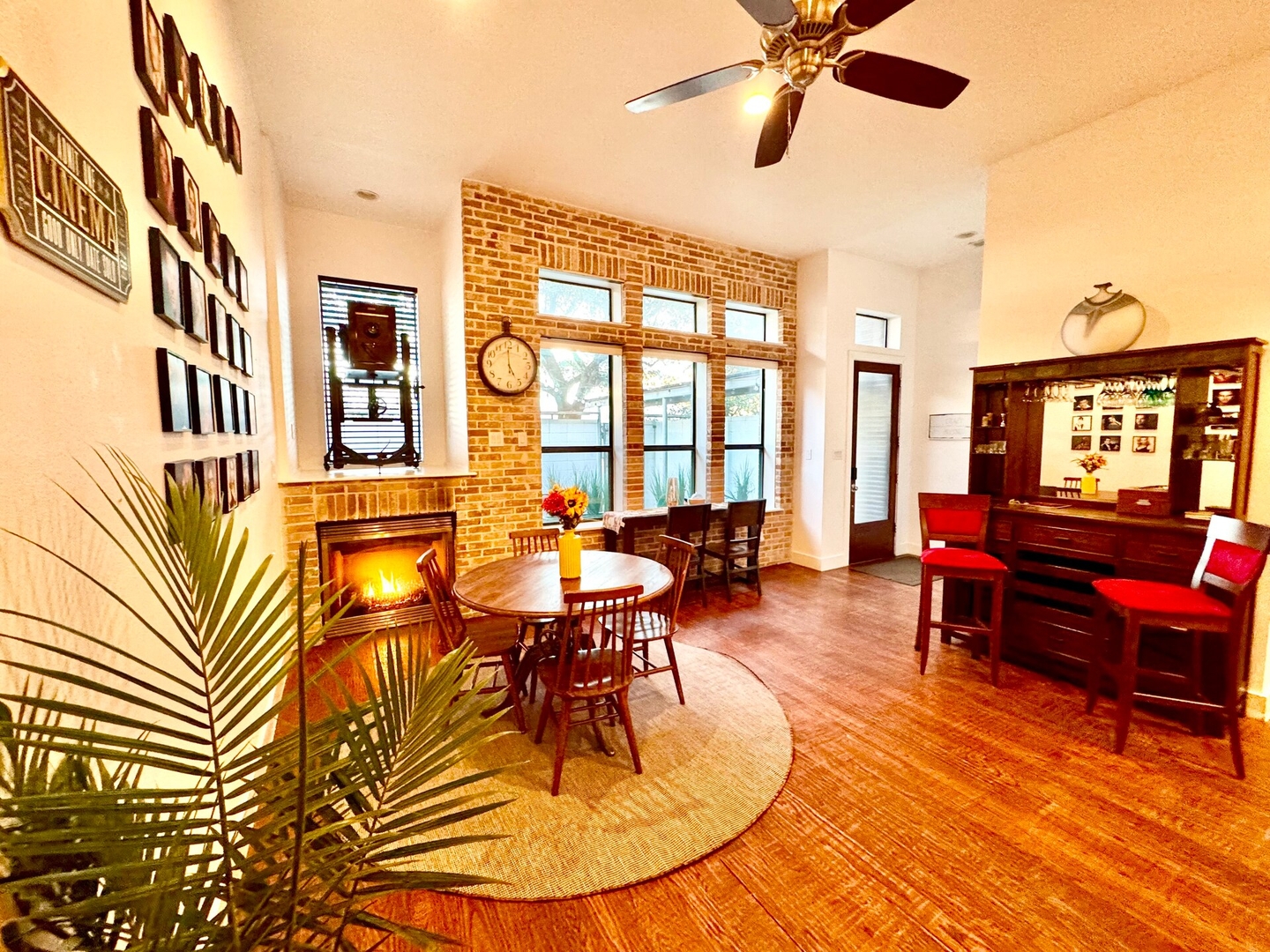 This stylish two-floor, chic industrial-style home features a modern open layout with exposed brick walls, soaring ceilings, and hardwood floors. Large motorized shades provide privacy while keeping the space bright and airy. The kitchen, dining, and living areas flow seamlessly, making it perfect for gatherings.